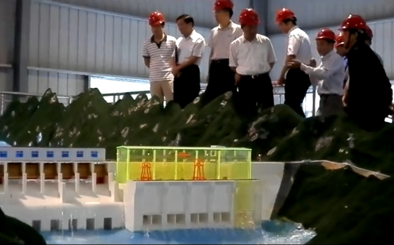 領(lǐng)導(dǎo)在觀看我公司制作的大型水利樞紐動態(tài)演示沙盤